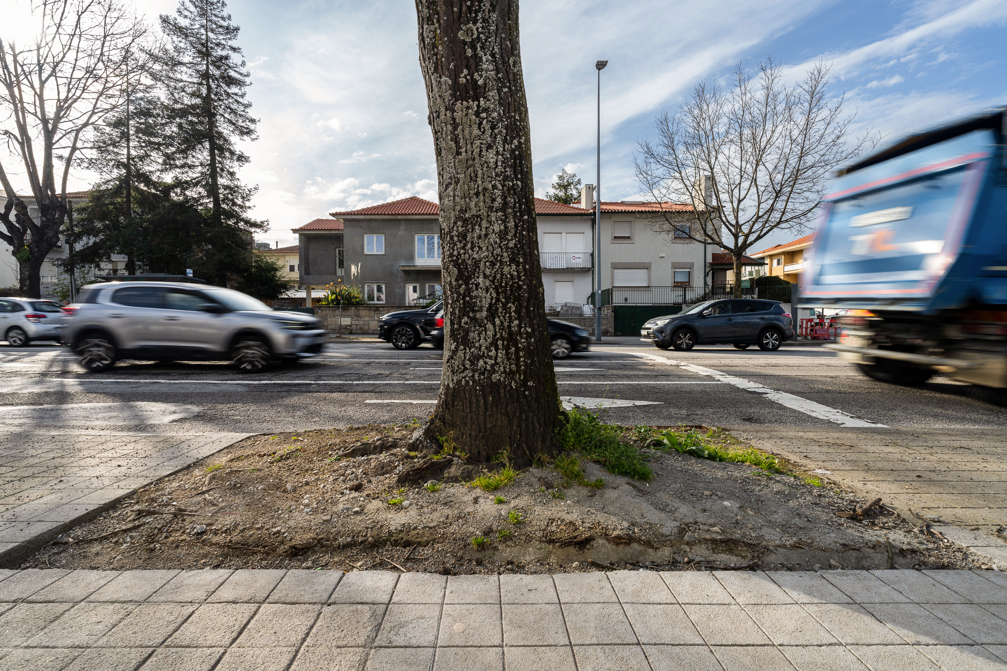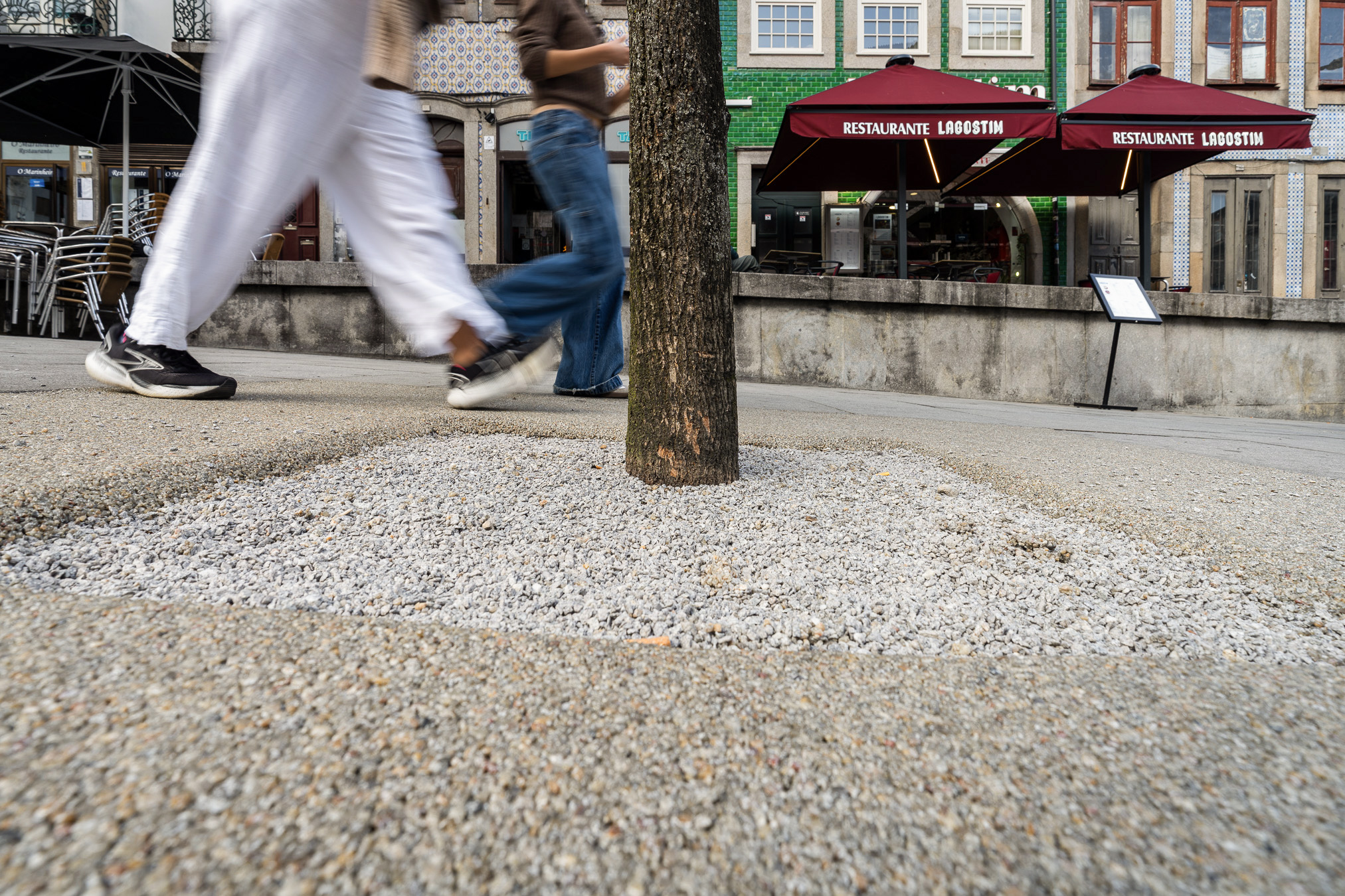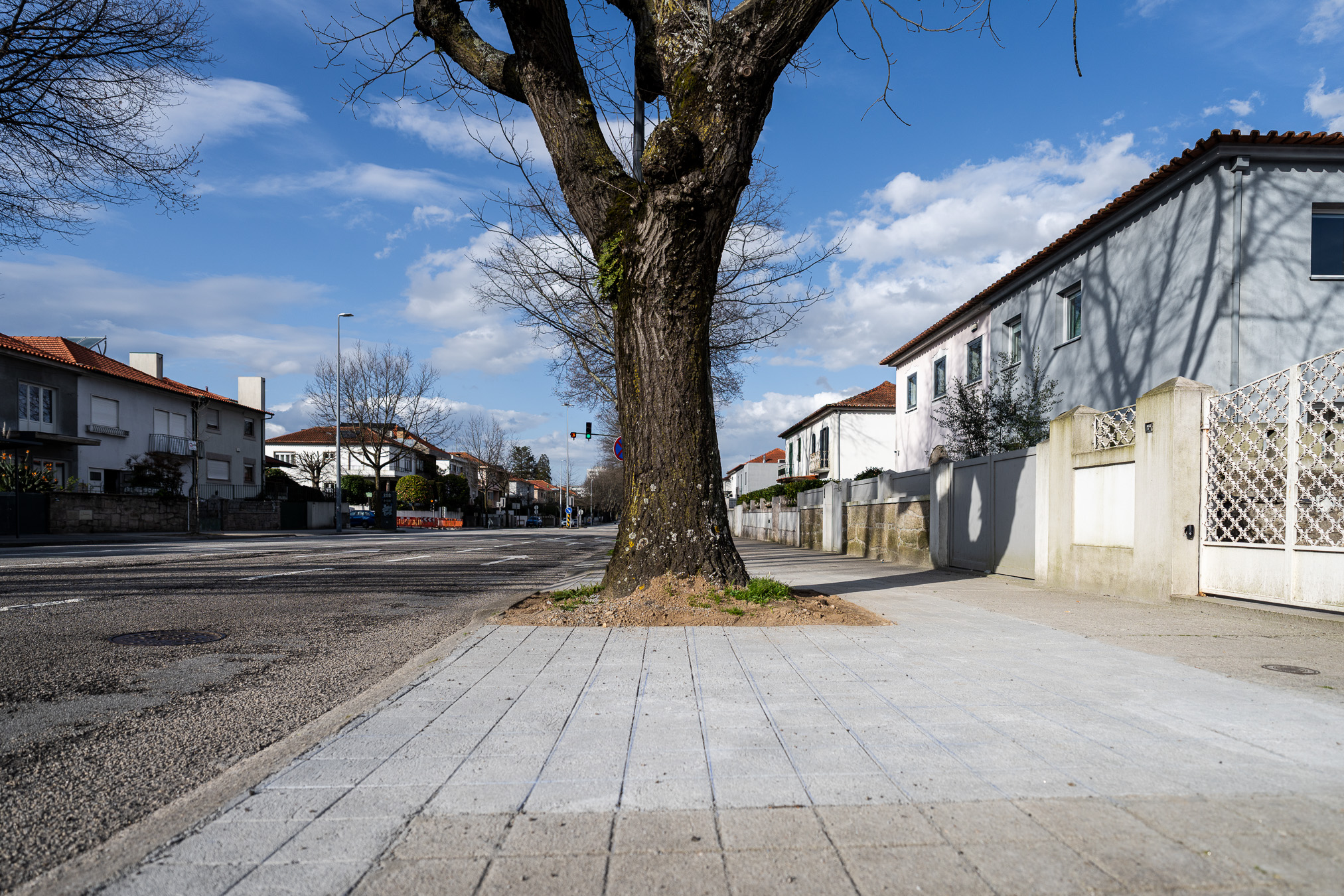 Através da aplicação de soluções técnicas sustentáveis, como pavimentos permeáveis em argamassa sintética e guias de remate em chapa de aço ou granito, a intervenção eliminou as patologias causadas pelo levantamento dos pavimentos, garantindo simultaneamente a proteção do sistema radicular das árvores.